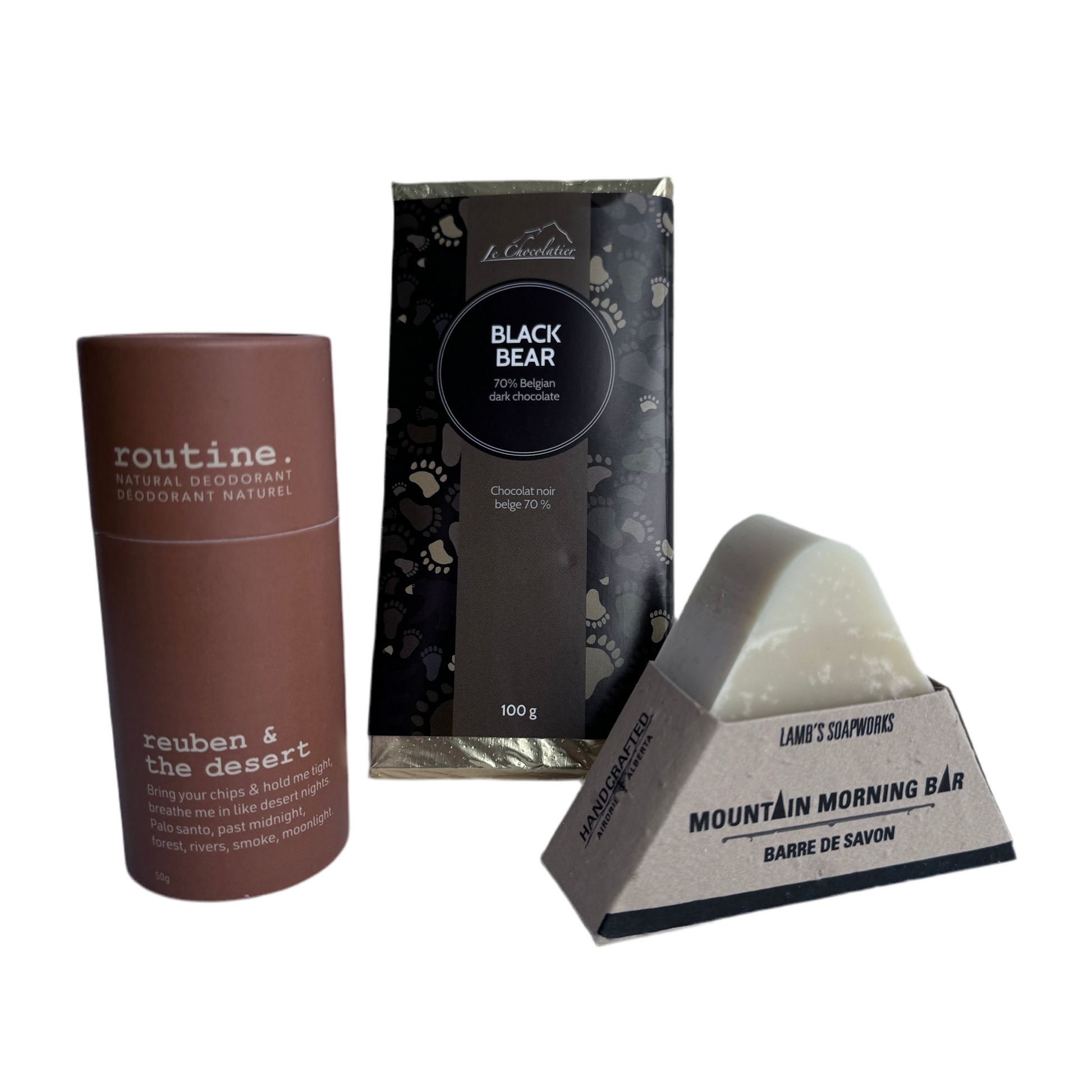 A few things to add to his stocking this Christmas. All natural mountain soap, clean smelling and healthy deodorant and a locally made chocolate bar. Keeping it simple!