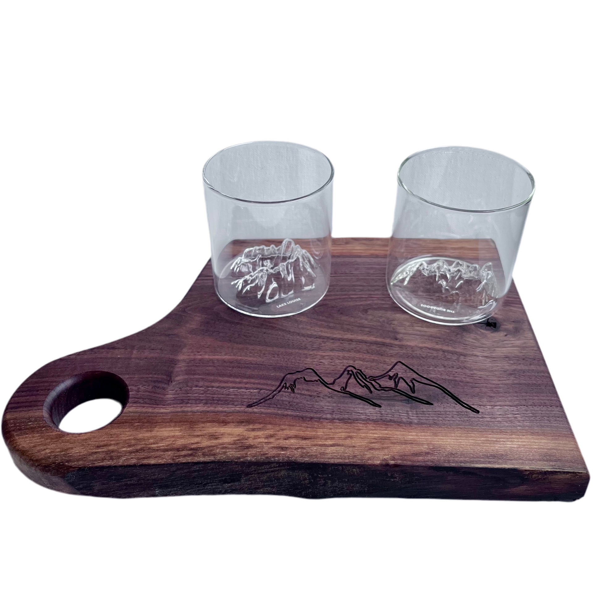 Wow your guest with a handcrafted, beautiful Charcuterie board and 2 Mountain pack glasses.
